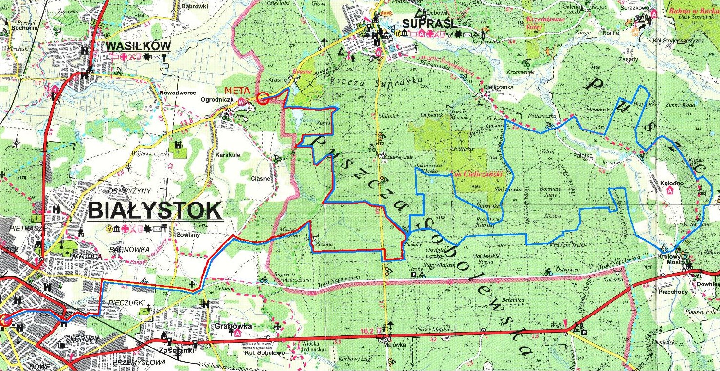 Podane odległości zawierają przejazd honorowy przez miasto 7,5km. Przejazd ulicami Białegostoku odbędzie się pilotowaną kolumną z prędkością około 18km/h. Po skręcie na drogę w kierunku Ciasnego kolumna zostania zatrzymana. Po ponownym ustawieniu zawodników start ostry dystansu Maraton nastąpi po 5 minutach, zaś dystansu Półmaraton po 15 minutach.
