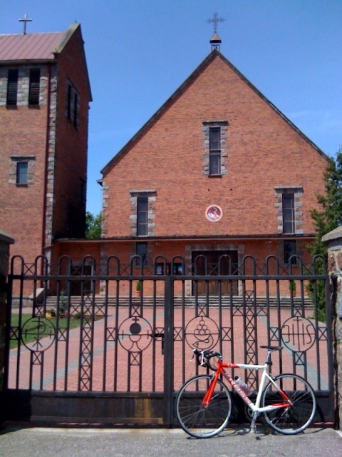Mój rower oparty o bramy kościoła w Sypniewie.